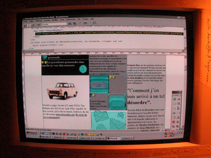 Revenons à nos moutons. Prenant une photographie de cette activité de corrections attentives, je mesure à quel point je trouve très laides toutes ces interfaces graphiques des différents programmes que j'utilise pour travailler les textes, les images ou les pages de site et c'est pourtant dans les ramifications et les détours de ces programmes que je parviens à donner corps à ces idées, celles même que j'ai pû avoir tandis que je poussais Madeleine sur sa balançoire, que je torchais Nathan ou même que je faisais la vaisselle: là aussi que d'heures passées devant une image lumineuse souvent trouvée moche!