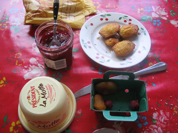 La table du petit-déjeuner telle que me l'on laissée les filles ce matin. La fatigue de la soirée, la mauvaise nuit, je n'ai pas très faim et pourtant ces quelques fruits, ce petit morceau de pain et cette confiture me mette en appétit. Je prépare le thé.
