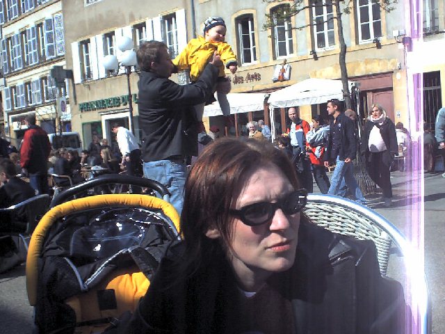 Nous rencontrons un couple de connaissance, Aline et Vincent et leur petite fille Lou-Anne (12 mois). Nous leur proposons de boire un coup en terrasse (3 Monaco et un panaché) sur la place St-Jacques de la ville de Metz. Après quelques minutes au soleil, une manifestation pro-palestinienne débarque et met une ambiance du tonnerre dans le centre-ville, Malheureusement toutes les photos (une vingtaine) de la scène sont ratées. J'enrage.