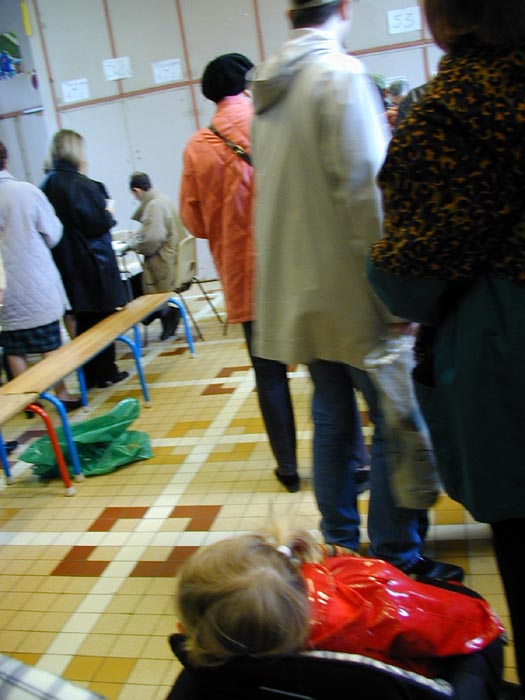 Des jeunes devant nous disent qu'il faut envoyer le bulletin Le Pen à Chirac avec un message du genre : on n'a pas voté pour toi mais contre Le Pen. Comme s'il ne le savait pas... Cyrille vote pour sa copine Elisabeth, qui est aussi notre voisine de palier, partie en vacances aux Etats-Unis. Le président du bureau, qui est aussi un voisin, mais du bout de la rue, me demande si je veux faire mon devoir de citoyenne et venir dépouiller. Je lui réponds que cette fois-ci c'est mon mari, moi j'ai dépouillé il y a quinze jours.