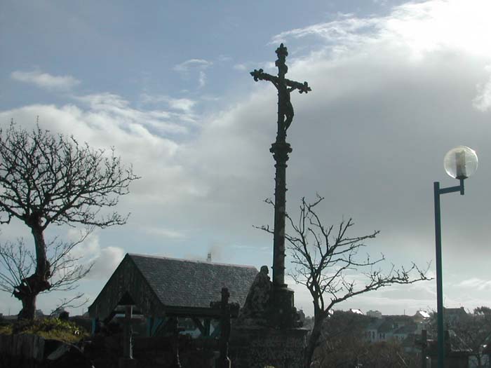 Nous prenons le car pour la "capitale" Lampaul. J'aurais préféré marcher, mais notre temps est compté. Le calvaire protège la "ville".