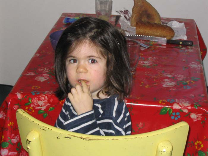 Nina termine son petit-déjeuner toute seule, toujours un doigt dans la bouche : "Je suis en retard ?".
